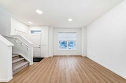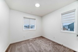 Discover exceptional comfort and modern style in this almost new semi-detached home, ideally positioned on a desirable corner lot in one of the city’s most sought-after lake communities. Immaculately maintained and barely lived in, this residence exudes a bright, fresh ambiance from the moment you step inside. Designed for today’s lifestyle, the open-concept main floor showcases an airy, contemporary palette complemented by expansive windows and thoughtfully curated finishes. Luxury vinyl plank flooring flows seamlessly from the spacious great room—with its oversized feature window—into the designated dining area and onward to the stunning chef-inspired kitchen. Here, a generous central island with quartz countertops anchors the space, paired with sleek stainless steel Kitchenaid appliances including a French-door refrigerator with ice and water, built-in microwave, dishwasher, an upgraded gas range and pull-out garbage for ease of convenience. The classic subway tile frames in the designer hood fan compliments the capped cabinetry and modern fixtures. The upper level features three spacious, sun-filled bedrooms—each offering a clean, minimalistic backdrop ready for your personal touch. The primary suite is a true retreat, complete with a 4-piece ensuite bathroom and a walk-in closet for added comfort and convenience. An additional 3-piece bathroom on this level provides thoughtful functionality for family members or guests. All bathrooms throughout the home highlight elegant quartz countertops, wood-grain vanities, curved shower rods and marble-style tile for a refined, cohesive look. A dedicated upstairs laundry room, complete with an LG ThinQ washer and dryer, enhances everyday convenience for busy families. Additional features include custom blinds on all windows and Carrier central air conditioning for year-round comfort. A separate side entrance with precast stairs adds flexibility and potential for future development, a home-based business, or multigenerational living. Durable Hardie Board siding enhances both style and longevity on this spacious corner lot. Located within a vibrant lake community, residents enjoy year-round access to bicycle and walking paths, beach, water activities, and a welcoming community atmosphere—while being just minutes from schools, shopping, and major commuter routes. Whether you're a first-time buyer, investor, or downsizer, this move-in-ready property offers exceptional value, modern design, and an unbeatable location. Don’t miss this rare opportunity to make it yours.