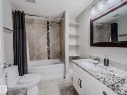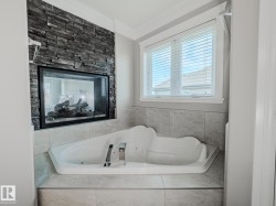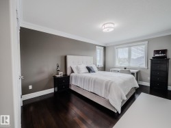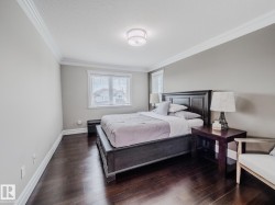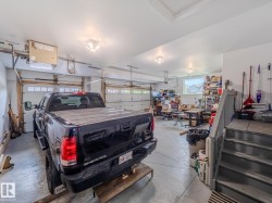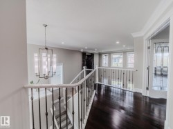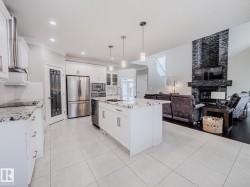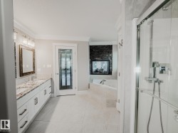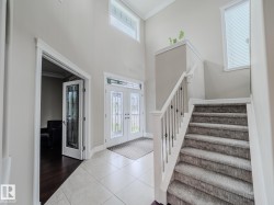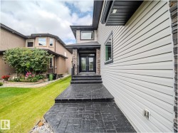 This immaculate, exceptionally clean 2-storey offers over 3600 sqft of beautifully finished living space & shines with pride of ownership. Step inside to soaring 18’ ceilings, a striking stone fireplace, Jatoba hardwood floors, granite throughout, in-floor heating & central A/C. The kitchen has a walk-thru pantry, built-in stainless appliances & was fully upgraded recently w/ refinished cabinets, new backsplash, new sink, new fridge, new dishwasher & new cooktop. Upstairs, find an expansive primary suite w/ 2-way fireplace, Jacuzzi tub, private balcony & huge walk-in closet. The basement is bright & finished w/ large windows, a 4th bedroom, family room, exercise space & full bath. The main floor den/guest bedroom adds flexibility. But the real showstopper? A massive, heated, triple garage w/ dual floor drains & so much space you can easily walk between vehicles—truly rare! Quiet cul-de-sac near ravine trails, zero-maintenance deck, stamped concrete & professional landscaping.