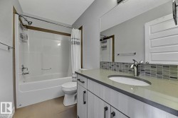 Welcome to Regency at Windermere, located in one of Edmonton’s most prestigious neighbourhoods. This stunning 4-bedroom, 3.5-bath townhouse features hardwood and tile flooring, quartz countertops, and stainless steel appliances. The open-concept main level offers a bright kitchen, dining, and living area with large windows and a balcony, plus a convenient 2 pc bath. Upstairs, you’ll find 2 spacious bedrooms, a 4 pc bath, laundry, and a primary suite with a walk-in closet and a 4 pc ensuite. The fully finished basement adds a recreation room and 3 pc bath, perfect for hosting friends and family. Enjoy the comfort of a double attached garage and thoughtful design throughout this elegant home.