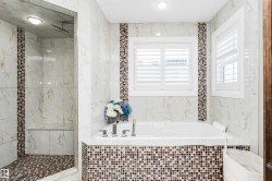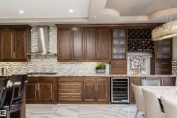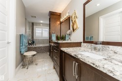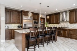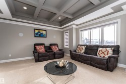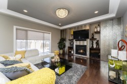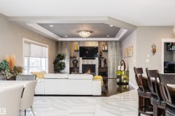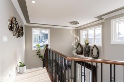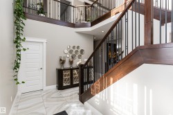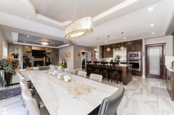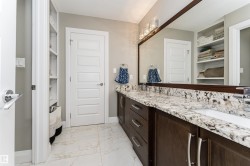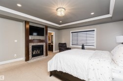 Stunning, 2-story mansion offers a total of 4460 sqft of living space! With incredible attention to detail, this custom home features marble-accented tiles, exotic granite, LED steps/under-counter lighting, crown mouldings & spectacular ceiling designs throughout. The main level features a magnificent living rm, a spacious den, a 4pc bath & a laundry w/sink. The living rm has a dramatic tile feature wall with a gas fireplace. Chef's dream kitchen w/ample charcoal maple cabinetry, large island, wet bar, large pantry & dining area. Upgraded wood/metal staircase leads to the lavish primary suite, which boasts a gas fireplace, a spa-like ensuite w/H&Hs sinks, a Jetted Jacuzzi, a custom mosaic steam shower, and H&Hs closets. To follow, 2 more beds w/J&J bath, another 2pc bath, and a bonus rm with cathedral ceilings. Basement secondary suite with a separate entrance, 2 oversized beds, Kitchen, living rm, full bath & laundry. Triple garage, excellent curb appeal, fully landscaped backyard, deck, and a shed.