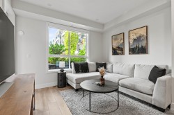Spacious, like new (without the gst!), ground floor one bed + den unit located at the Garrison Campus master-planned community: The York Residences by Diverse Properties. This beautiful home spares no expense and features quartz countertops, sleek stainless steel appliances and air conditioning! This ground floor unit faces the quiet side of the complex and opens up directly to the park. A 10/10 central location within close proximity to everything you could need need. Walking distance to shopping, various dining options, a pharmacy, the University of the Fraser Valley and the Vedder river! Book your showing today.