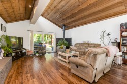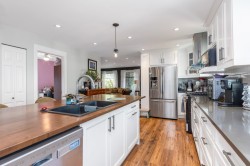 Beautifully renovated and full of West Coast charm, this 3-bed rancher is tucked away on a quiet cul-de-sac. The gorgeous kitchen has loads of cabinets and counter space with a massive island. Step down into the formal living room with vaulted wood ceilings and stone fireplace. The primary bedroom with 2 pc ensuite (closet is plumbed for a shower) and french door access to the back yard is a dreamy oasis. The backyard has a massive deck overlooking a private, fenced yard that backs directly onto Newlands Golf Course, with a gate for easy access. Enjoy the two storage sheds & RV parking. There's a potential future use to Low Rise Residential, Buyer to confirm with the City. Live long term or hold for investment!