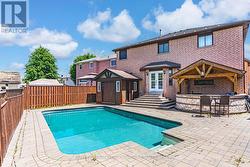 RESORT-STYLE BACKYARD WITH SALTWATER POOL, COVERED HOT TUB & OUTDOOR BAR, 3-CAR HEATED/INSULATED GARAGE, OVER 4,000 SQ FT & MULTI-GENERATIONAL LIVING! Get ready to fall for this entertainer's dream in Barrie's Painswick South, where a resort-style backyard, over 4,000 finished sq ft of space, and a rare triple garage take centre stage! Set on a 67 x 117 ft lot on a quiet, family-friendly street, this stately brick 2-storey home makes a strong first impression with dark-trimmed windows, well-kept landscaping, and a wide driveway with parking for multiple vehicles. The triple garage is insulated, heated, finished with epoxy floors, and includes three automatic door openers - perfect for vehicles, toys, or a workshop. The backyard is built to impress with a saltwater pool with newer pump, large interlock patio, covered hot tub cabana, and a custom outdoor bar with a curved stone-faced counter, bar-height seating, and vaulted wood pavilion roof. The spacious white shaker kitchen features quartz countertops, stainless steel appliances, a double undermount sink, island with seating, beverage fridge, and a built-in sideboard with extra cabinetry. A combined living and dining room offers excellent flow, while the sunken family room adds warmth with hardwood floors, a dark feature wall, gas fireplace with hex tile surround, white trim detail, and wood mantel. A main floor laundry room adds function with garage access and laundry sink. Upstairs offers four bedrooms, including a generous primary suite with walk-in closet and 5-piece ensuite with soaker tub, double vanity & separate shower, plus a bright reading nook with arched window. The finished basement offers in-law or multi-gen potential with a full kitchen, rec room, bedroom, 4-piece bath & theatre room with double French doors, mural walls & space for elevated seating. Located in Barrie's Painswick South, walking distance to schools, Zehrs, Shoppers, LCBO, salons, restaurants, library, transit & Barrie South GO. (id:27)