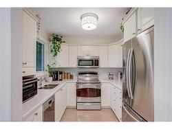 Welcome to your happy place! This beautifully cared-for 3-bedroom townhome (in one of Burlington’s most sought-after complexes!) backs right onto a storybook ravine and babbling creek. Step outside to your massive private deck and soak in the peaceful, forest views — perfect for morning coffee or sunset cocktails. Inside, the main floor is made for entertaining! The updated kitchen sparkles with quartz countertops, sleek modern cabinetry, a GE induction stove, and a Bosch dishwasher. Whip up dinner while chatting with guests in the open-concept dining/living room, then cozy up around the gas fireplace. The family room off the kitchen is a sunlit retreat, with huge windows framing those gorgeous ravine views.Upstairs, the home has been reimagined into 2 spacious bedrooms, each with their own ensuite (but yes — it can be converted back to 3 bedrooms if you prefer!). The primary suite boasts an updated ensuite, a dreamy screened balcony, and plenty of room to unwind. The second bedroom is equally spoiled with a private full bath, and luxury vinyl floors done throughout the 2nd floor (2025).The lower level is another slice of paradise — a bright above-grade bedroom, a rec room with a walk-out to that jaw-dropping deck, plus laundry and storage. Bonus? You get outdoor space on EVERY level — a rare treat!You’ll also enjoy a double-wide driveway, private garage, and a friendly community with an outdoor pool, party room, and snow removal right to your doorstep. Love the outdoors? Kerns Park, golf, and tennis are all within walking distance. Need to commute? You’re minutes from the 403, 407, and QEW. This is more than a home — it’s a lifestyle. Don’t miss your chance to make it yours!