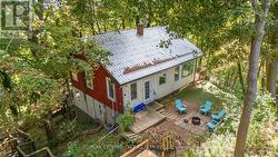 Treetop oasis in the quaint beach community of Port Stanley offers a unique destination appealing to those seeking a short-term getaway or family destination, merely steps from the beach & beautiful shores of Lake Erie. This high demand, income generating property with proven success & approximately 50K of annual revenue provides the best of BOTH worlds for those eager to acquire a vacation home while maintaining the opportunity to generate rental income when not occupied for yourself. WIN-WIN! With breathtaking, panoramic views of Main Beach to the South and Little Beach to the East, this property will captivate each visitor. A peaceful retreat, perched elevated amongst the trees, this is your chance to own your own piece of paradise! Bright oversized windows overlook a newly built deck where you'll experience the soundtrack of waves & spectacular water vistas. Plenty of seating in the dining area ensures a crowd can be hosted with ease. A functional kitchen includes fully updated finishes with chic new cabinetry, stylish new appliances, laundry & access to side yard. Generous living room includes three large patio sliders with gorgeous views of the lake & cozy wood burning fireplace. Primary bedroom includes multiple bright windows & private ensuite with free standing tub. Head upstairs to discover two additional bedrooms as well as updated 3PC shower. Significant renovations completed including updated Northstar windows, luxury vinyl plank flooring, drywall, paint, metal roof, deck & AC. Lower level is ready for your finishing touches, currently roughed in with electrical plumbing to complete a self-contained studio apartment or added living space. Deeded parking includes space for two vehicles as well as storage shed, just steps away on Sydenham St. A short walk brings you to the beach as well as many of Port Stanley's amazing restaurants & amenities. Truly a destination to appreciate with great appeal to enjoy as an income generating retreat! (id:27)