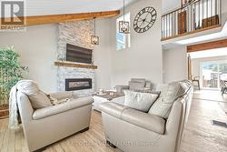 This 4-bedroom, 3-bath Viceroy-style home is beautifully updated throughout and ready to impress. Step into the inviting living room featuring rich hardwood floors, soaring cathedral ceilings, decorative wood beams, and a cozy fireplace. The modern kitchen is complete with sleek quartz countertops, flowing seamlessly into the dining area with direct access to the fully fenced backyard oasis featuring a pool and hot tub, perfect for entertaining or relaxing. Upstairs, you'll find three spacious bedrooms, a full bath with double sinks, and a charming balcony overlooking the living room below. The oversized primary suite offers abundant natural light, a walk-in closet, and a private 2-piece ensuite. The lower level extends the living space with a theatre room warmed by a gas fireplace, an additional 2-piece bath, a 4th bedroom, and a laundry area. A single-car garage, oversized driveway, and prime location close to parks, the ski hill, walking trails, and the river make this an ideal family home. (id:27)