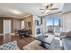 Welcome to RiverHouse, one of downtown Guelph's most sought-after condominium residences. This stylish turnkey suite pairs luxury finishes with an urban lifestyle just steps from the GO station, Sleeman Centre, Speed River and the city's best shops, dining, and downtown amenities. Inside, the open-concept layout is bright and inviting, with large windows and a private balcony showcasing panoramic city views. The kitchen features rich espresso cabinetry, granite countertops, stainless steel appliances, and an island with bar seating that flows seamlessly into the living and dining area. The living room offers elegant crown moulding, a fireplace feature, and sliding doors to the balcony - an ideal space for morning coffee or relaxing above the city. Both bedrooms are generously sized, with the primary suite offering floor-to-ceiling windows, a walk-in closet, and a spa-like ensuite with a glass-enclosed shower and stone vanity. A second full bathroom with a frameless glass shower serves guests and the secondary bedroom. Additional highlights include in-suite laundry, 2 underground parking spaces with an EV rough-in set up for future installation and a storage locker. RiverHouse provides a refined lifestyle with amenities such as a fitness centre, party room equipped with a bar/lounge, large outdoor terrace, and guest suite, all within a secure and well-managed building. A rare opportunity to experience upscale condominium living in the heart of Guelph's vibrant downtown core. All furniture can be purchased, see realtor remarks for further details.
