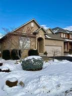 Gorgeous customized Bungalow is in "impeccable" condition inside and out! Original owner. Built in 2010. It Looks like new. Stunning. Premium lot backing onto greenspace/park. Extended Roof area to cover part of the back deck for protection from sun or rain. Extensive Landscaping front and back yard. 9 ft. ceiling main floor. Screen Door. Hardwood floors and ceramic main floor. Oak stair to lower level with carpet runner. 2 Bedroom Plus Den. Den with hardwood floor, beveled glass, pocket door & shutters. Customized kitchen with an abundance of upgraded cabinets; double depth pantry and cabinet over the fridge, valance, crown molding, upper angled corner cabinets, lower pie up corner cabinets, Breakfast bar, microwave shelf (excluded microwave), ceramic backsplash, gas stove added window over the kitchen sink. Stunning. Alarm. Upper cabinets in laundry room. Rough-in bathroom and enlarged window in large unfinished lower level. The list goes on.