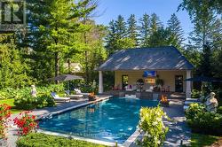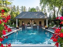 15 Chartwell Rd offers a lifestyle of unparalleled luxury. Drive through the gates & discover the grandeur of this palatial estate. South of Lakeshore,1 door from the lake on a HALF ACRE LOT. Painstakingly curated, the contemporary limestone masterpiece you've been waiting for. Solid iron doors lead to a grand foyer revealing the opulent book matched marble floors. Floor to ceiling wdws & French doors flood the house with light. Cascading waterfalls fank the hall.The Dining Room has statement lighting & servery making hosting a breeze. Soaring 18-ft ceilings & a grand gas f/p are focal points of the Great Room,w/captivating views of the resort style yard. Experience culinary excellence in the black lacquer& glass kitchen by NEFF that features top of the line appliances & a B/I coffee machine & butlers pantry. The intimate Living Room with f/p is the ideal retreat. A main floor office w/built-in cabinetry.2 powder & 2 laundry rooms. The backyard oasis has a gunite pool, waterfalls, fire bowls, covered terrace & outdoor kitchen & f/p.The pool house has a change room,3-pc bath & servery. Towering trees surround the home & are positioned to create privacy. A stone driveway,circular fountain & lush gardens create a breathtaking landscape.Floating marble stairs divide the 3 levels of this home or, you can take the elevator. Skylights make the upstairs airy & bright.The principal suite has nearly 13-ft ceilings, an exquisite 6-piece ensuite & 2 W/I closets. A private balcony overlooks the yard.3 add'l bdrms have 10-ft ceilings,private ensuites & W/I closets. The LL caters to all family members. A 5th bdrm/ensuite makes an ideal guest suite.Gym,R/I Golf Simulator,home theatre,Wine Cellar& doggie Spa. The Games & Rec Rooms have a 2nd kitchen & W/O.Heated garage,baths &LL flrs.Automation. Designed by Bill Hicks & features the artistic creativity of the KT Design Group. Located on Oakville's Street of Dreams, this is an iconic living space designed to impress!Luxury Certified! (id:27)