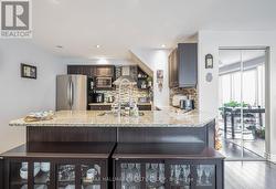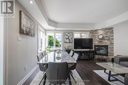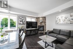Immaculately maintained and beautifully upgraded 2-bedroom condo with TWO parking spaces (#17 & #18), perfectly situated on a quiet cul-de-sac in one of Orleans most sought-after, well-developed neighborhoods. Offering over 1,000 sq. ft. of refined living space, this corner unit is the ideal choice for first-time buyers, professionals, or downsizers seeking both comfort and elegance. Step into a bright, open-concept layout where large windows and an unobstructed balcony view create an airy, private retreat shaded by mature trees for added tranquility. The living area is anchored by a gas fireplace framed by a striking brick feature wall, exuding warmth and character. The chef-inspired kitchen boasts granite countertops, stainless steel appliances, a gas stove, tiled backsplash, and a convenient breakfast bar perfectly blending style and function for both everyday living and entertaining. The spacious primary suite offers a walk-in closet and serene escape, while the versatile second bedroom is ideal for guests, a home office, or personal gym. The exquisite 4-piece spa-inspired bathroom showcases a freestanding limestone soaker tub and a separate glass shower for the ultimate in relaxation. Additional highlights include in-unit laundry, air conditioning, abundant visitor parking, and two dedicated parking spots. The corner-unit design ensures enhanced privacy, while the private balcony offers a peaceful space to enjoy morning coffee or evening sunsets. Unbeatable location just steps from the future LRT and within walking distance to shops, restaurants, parks, and every local amenity. Flooring: ceramic & laminate throughout. Move in and experience elevated condo living at its finest in prime Orleans today. (id:27)