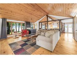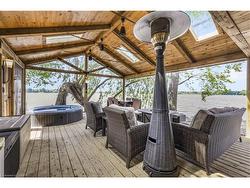 Welcome to your island paradise on Somme Island, located on the largest Kettle Lake in all of Ontario, Puslinch Lake. This one-of-a-kind property offers the ultimate in seclusion and natural beauty, with a picturesque setting and modern comforts throughout. Accessible only by water, the island features three separate boat docks for arrival, while a spacious parking lot on the mainland offers convenient vehicle access for you and your guests. As you step into the main residence, you'll be greeted by the warm charm of pine wood flooring that flows throughout the main level, creating a cozy, rustic ambiance. The kitchen is a chef’s dream, featuring granite countertops, a travertine tile backsplash, stainless steel appliances, under-cabinet lighting, and a large center island perfect for both meal prep and casual dining. The stunning living room is highlighted by a wood-burning fireplace set against a dramatic stone wall with a large hearth – the perfect spot to unwind on cool lake evenings. The main-level primary bedroom offers sliding glass doors that open directly onto the deck offering seamless indoor-outdoor living. Large windows frame tranquil lake views, making every morning feel like a getaway. Relax in your stunning sunroom, complete with a hot tub, skylights, and breathtaking lake views. A unique spiral staircase leads to the upper level, where you'll find two additional bedrooms, each with pine wood flooring. One of these charming rooms includes a walkout to a private balcony – the perfect place to sip your morning coffee while taking in the serene surroundings. Surrounding the home is over 7 km of private shoreline, a grassy area, docks, fire pit, and 3 decks, all ideal for playing, fishing, swimming, sunbathing, and lakeside relaxation. Whether you're looking for a summer escape or a year-round sanctuary, this exceptional island property offers a rare opportunity to own your own slice of paradise!