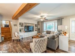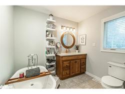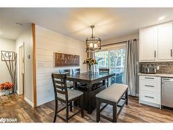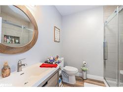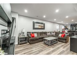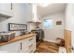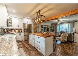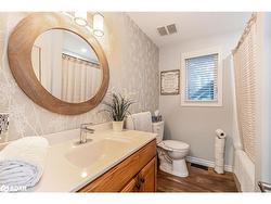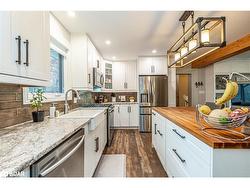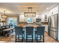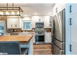 TURN-KEY MODERN LIVING NEAR GEORGIAN BAY WITH DESIGNER FINISHES & IN-LAW SUITE POTENTIAL! Tucked away on a peaceful 0.36-acre lot framed by mature trees, this beautifully crafted 2019 home offers a calm, connected, and effortlessly modern lifestyle. Step inside to the bright, open-concept main living area, where sunlight pours through large windows and highlights sleek vinyl plank floors, pot lights, and timeless neutral finishes. The kitchen is the true heart of the home, featuring crisp white cabinetry, stainless steel appliances, pendant lighting, a subway tile backsplash, a stunning butcher-block island perfect for casual breakfasts, and a charming apron sink overlooking the yard. Whether you’re hosting dinner with friends or enjoying quiet evenings in the adjoining living room, every detail feels designed for connection and ease. The thoughtful layout places the spacious primary suite in its own private wing, complete with a walk-in closet and an elegant 4-piece ensuite for a quiet retreat. Downstairs, the bright lower level boasts 8.5-foot ceilings, a large rec room with a bar, a bedroom, a full bathroom, and a walk-up entrance to the garage, providing ideal in-law suite potential or extra space for entertaining. Outside, enjoy the fresh air and natural beauty that come with being just minutes from Georgian Bay’s beaches, local parks, dining, and recreation. Complete with a fully insulated double garage with drive-through access, a high-efficiency furnace, and a 200-amp panel, this move-in ready #HomeToStay delivers comfort, versatility, and a setting you’ll never want to leave!