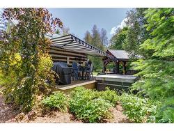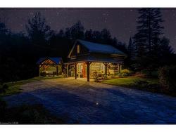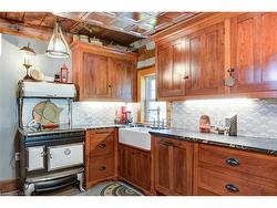 Discover the charm of this stunning century-old log cabin, beautifully set on a peaceful creekside lot. Thoughtfully renovated to blend rustic character with modern comfort, this one-of-a-kind retreat offers a warm and inviting lifestyle.The heart of the home features a custom cherry kitchen with leathered granite countertops, a live-edge wood counter in the butler’s pantry, and premium Bosch appliances (2023). Heated floors in the kitchen prep area and bathroom provide everyday luxury, while the propane fireplace (serviced May 2024) creates cozy ambiance year-round.A versatile bunkie/guest house/home office, complete with its own electric fireplace and keyless entry, expands your living or work-from-home options. Step outside to enjoy the custom timber-frame pavilion with industrial-grade heat, retractable screens, and LED lighting—perfect for entertaining or relaxing by the creek.Practical upgrades include a new water heater, pump, and water softener (2022), with the septic pumped in June 2023. The professionally landscaped 0.37-acre property features a retractable awning, dusk-to-dawn driveway lighting, and propane BBQ hook-up.With 103 ft of frontage and serene creek views, this remarkable property offers the perfect balance of character, comfort, and natural beauty. A truly rare opportunity to make a log cabin retreat your year-round home.