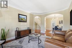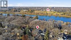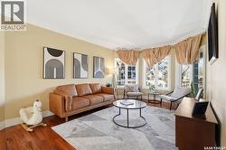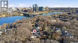 Quiet elegance is what you will feel in this stunning 2 storey located on a historic street close to the river with loads of curb appeal. The entrance leads you into a grand open concept living space with loads of natural light and vaulted ceilings that seem to go on forever. A bright skylight, stainless steel appliances, adjoining living room with fireplace and engineered hardwood flooring make this living space a place to gather with family and friends. What would make this gathering place even better? Main floor wet bar of course. This home has everything! There is main floor laundry, direct entry to garage as well as direct access to the backyard and 2 tiered deck with hot tub right off the dining room and kitchen. The primary suite boasts a stunning 5 piece ensuite with his and hers sinks, soaker tub and separate shower. There are 2 other good sized bedrooms and 4 pc bathroom. The finished basement is perfect for a family – loads of space for teens to occupy or for a young family to have a play area for small children. The backyard is an oasis with a hot tub, 2 tiered deck leading to lush grass and assorted foliage. The home is located steps away from the South Saskatchewan River and all the wonderful walking paths. Enjoy sunrises and sunsets on the front porch or back deck, either way, it is luxury at its finest! Call now to book your private showing. (id:27)