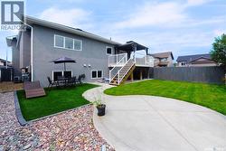 From the moment you step inside, a bright and welcoming foyer invites you toward a thoughtfully designed main floor, complete with a mudroom and laundry area for everyday convenience. At the heart of the home, a chef-inspired kitchen commands attention—anchored by an impressive 10-foot quartz island with a dedicated prep sink (total 3 sink in kitchen), bringing the total to three sinks for effortless workflow. Premium touches abound, including soft-close cabinetry, double wall ovens, an undermount sink perfectly positioned beneath a yard-facing window, a functional desk niche, and the ingenious built-in Vroom kitchen vacuum system. Soaring cathedral ceilings and rich hardwood flooring frame the open-concept great room, where a gas fireplace creates an inviting focal point. The adjoining dining area—custom-designed to host large gatherings—flows seamlessly onto the deck, merging indoor and outdoor living. Two generously sized bedrooms and a full 4-piece bath complete this level. Upstairs, the private primary retreat is a sanctuary of luxury, featuring a spa-inspired ensuite with a Jacuzzi tub, a glass-enclosed tiled shower, dual undermount sinks, ample storage, and an expansive walk-in closet with built-in laundry chute. The bright, fully developed lower level offers extra windows draws lots of daylight, an electric fireplace, and a spacious family/rec room ready to adapt to your lifestyle—whether it’s a games area, home theatre. Two additional bedrooms and a third full 4-piece bath ensure comfort for family and guests alike. Every detail has been considered, from custom closet organizers in each bedroom to stair lighting, central air, a heat recovery ventilation system, and a full central vacuum with a Vroom in the kitchen, rental alarm system for security. Outdoors, a fully fenced yard with patio and lush green space sets the stage for summer entertaining or peaceful evenings under the prairie sky. Close to School and easy access to highway 16. (id:27)