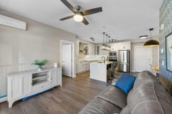 Experience the perfect blend of style, comfort, and convenience in this beautifully designed 2-bedroom, 2-bathroom ground-floor condo in Auburn Bay. Once a Logel Homes show suite, this home still feels brand new and offers a private walkout entrance directly to ground level—a rare feature that’s perfect for pet owners or anyone who loves easy, everyday access. Flooded with natural light, the spacious west-facing patio includes a gas line for your BBQ, making it ideal for outdoor dining and entertaining. Inside, the open-concept layout showcases thoughtful upgrades, including waterfall-edge quartz countertops on the kitchen island, full-height cabinetry with under-cabinet lighting, a built-in wall oven and microwave, electric cooktop, and luxury vinyl plank flooring throughout. The primary suite features a spa-inspired ensuite with dual sinks, a fully tiled shower, and a custom walk-through closet with built-ins. A second bedroom and full bath provide flexible space for guests or a home office. Enjoy year-round comfort with central A/C, titled underground parking, and a secure storage locker. Pets are welcome with no size or breed restrictions, and low condo fees include heat, water, and maintenance. Located in Calgary’s sought-after lake community, residents enjoy access to Auburn Bay’s private beach, clubhouse, and pathways—just minutes from shopping, restaurants, the South Health Campus, and the Brookfield YMCA. This is stylish, low-maintenance living at its finest—this is a must see!