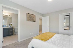 "Open House - December 7th 300pm-430pm* Welcome to this beautifully finished 3-bedroom, 2.5-bath detached home in the vibrant, amenity-rich lake community of Mahogany. Offering 1,441 square feet above grade and upgraded to 9-foot basement clearance, this home blends stylish design with everyday functionality in one of Calgary’s most sought-after neighbourhoods.Step inside to discover high ceilings on the main and an open-concept floorplan featuring midnight blue kitchen cabinetry, sleek stone countertops throughout, and a premium Blanco Horizon undermount sink. The space is as practical as it is striking, with a front-load washer and dryer conveniently located in the upstairs laundry.The elegant primary suite includes a spacious walk-in closet and a private 3-piece ensuite, while two additional bedrooms provide space for family, guests, or a home office. From top to bottom, the home is thoughtfully finished with a refined, modern touch.The basement can be finished to give a spacious and airy feel with the high ceilings. There is ample room and an egress window for a generous sized bedroom and also the ability to utilitze the existing rough-in for a full bathroom development.Outside, enjoy a low-maintenance front yard, a fully fenced backyard for added privacy, and paved lane access to your oversized parking pad. You're just 1 km from the Mahogany Beach House—offering year-round recreation like swimming, fishing, tennis, paddleboarding, skating (including a 2.4 km skating path), hockey, volleyball, playgrounds, a gymnasium, splash park, basketball courts, and even firepits for cozy evenings.Whether you're an active family or looking for a peaceful retreat in a lake community, this home delivers on all fronts. Book your private tour today and experience the best of Mahogany living!