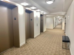 Presenting the largest corner unit in the building—an exceptional 2-bedroom, 2-bathroom residence offering 1,038 square feet of thoughtfully designed living space. This upgraded residence features stylish engineered hardwood flooring and an open concept floor plan. A spacious and welcoming foyer with a double closet sets a sophisticated tone upon entry. Expansive windows throughout the unit allow for an abundance of natural light, further enhanced by the addition of elegant, customized double-layer curtains that provide both privacy and light control. The modernized kitchen is outfitted with updated cabinetry and striking black granite countertops, complemented by a suite of matching black appliances. The generous living room offers ample space for comfortable seating arrangements, with an adjacent dining area that opens to a private balcony featuring pleasant views. The primary bedroom includes a well-appointed four-piece ensuite, adding to the home's overall functionality and comfort. Residents will appreciate the building’s direct access to essential amenities, including nearby grocery stores and restaurants, all reachable without the need for elevator use. A convenient door one level below provides quick, weather-free access to Save-On-Foods via the 4th-floor parkade. Additional features include on-site security, a dedicated concierge, and ample indoor and guest parking. Situated in a highly desirable location within walking distance of numerous services and conveniences, this professionally upgraded unit with a sought-after layout represents exceptional value in today’s market.