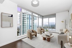 Met 2 by Concord Pacific - located across to desirable Metrotown Shopping Centre. This elegant NE corner of 2 bed+2 bath unit offers a sophisticated urban lifestyle with breathtaking panoramic views of the city, mountains and lake. This home features laminate flooring throughout and freshly painted interiors. The unit features a luxury modern design including: centralized heating and A/C, 8'8" high ceiling, roller-shade window coverings, European appliances, 5-heads gas cooktop, quartz stone countertop; marble tile backsplash, marble tile flooring and a huge balcony for entertaining. Amenities incl.: lounge, indoor pool, hot tub, sauna/steam room, dance/studio/games room, lawn bowling, fitness center, Karaoke lounge, outdoor BBQ and HD Golf simulator. Best view best layout!