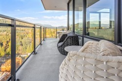 Beautifully updated 2 BED & DEN at the Alina in Coquitlam, offering an ideal location and stunning VIEWS. Professionally upgraded by A2H Design, it’s the ONLY suite with premium upgrades incl. designer lighting. Floor-to-ceiling windows frame unobstructed VIEWS of City and Mountains. The kitchen features mid-century inspired cabinetry, SS appliances incl. gas range. Enjoy a covered 220 SF wrap-around deck, split BED layout for privacy, and a DEN that can serve as a 3rd BED or office. The ensuite showcases a walk-in glass shower and modern finishes. Includes 2 Parking, Storage, access to a 6-level parkade, bike storage, EV charging, pool & hot tub. Steps to SkyTrain, shops, dining, parks and trails. BONUS: Furniture can be included with sale. Shown by appointment.