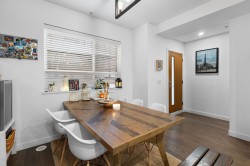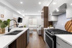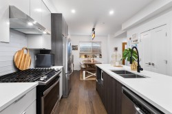Welcome to this very clean and very well-kept 3 bed and 2.5 bath townhouse in The Terraces! The main floor offers an open-concept living room, a kitchen with a large island with a quartz countertop, and a dining area, which leads to a patio with turf. The upper floor has a decent-sized primary bedroom with its own ensuite and two additional bedrooms and a family bathroom. Additional features include central AC and hot water on demand. This centrally located complex is just a few minutes' walk to shopping, restaurants, recreation, parks, and the future new Skytrain station.Bonus EV charger, Updated Washer/Dryer, Hoodfan and hot water. Move in ready!