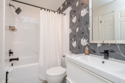 BETTER THAN NEW! This TOP FLOOR 2 beds/2 full bath unit offers 872sf of living space! As you enter you will feel the warmth of this home that has been tastefully updated. Starting with the kitchen that offers a good sized island, all new two toned cabinet doors/hardware, beautiful backsplash, granite counters, & S/S appliances. Main living is flooded w/natural light & features modern wall mounted fireplace + updated modern blinds. 2 good sized bedrooms (both w/new flooring) on opposite sides. Main bath beautifully updated w/new vanity, modern finishing/wallpaper & flooring. Ensuite updated w/ gorgeous new shower, counter, hardware, & flooring. In-suite laundry (updated washer/dryer) + storage room in unit. Great location close to schools, shopping, parks, amenities & future skytrain!