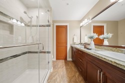 Stunning 1,602 sq.ft. ground floor condo with large enclosed solarium! The sought-after Executive M2 Plan offers the best layout for comfort and functionality. Open concept design ideal for downsizers or families! Gourmet kitchen with granite counters, solid wood cabinetry, pantry, gas range and S/S appliances. Features 9 ft ceilings and A/C throughout. Two primary-style bedrooms on opposite ends for privacy. Bathrooms feature heated floors, fog-free mirrors and double sinks. Includes 3rd bedroom plus spacious den (or 4th bedroom). Enclosed solarium with retractable glass panels and gas BBQ hookup for year-round use. Direct outdoor access—perfect for pet owners & steps to the dog park! Two parking stalls (1 oversized) & large roll-up storage locker. Unbeatable Willoughby Heights location!