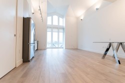 This rarely available large studio top-floor condo, fully renovated with entirely brand-new features including appliances, tall cabinets, quartz countertop, flooring, laundry, 2 in-suit storage spaces, galley kitchen, spa-like bathroom, heated floor, security system, fresh paint, a soaring 15-foot cathedral ceiling & oversized windows allowing plenty of natural light inside. The parking stall & the unit are both right next to the elevator. Exclusive access to the Fremont River Club & amenities including a pool, Gym, basketball court, meeting room & much more. Near Fremont Village shopping, schools, transit & the scenic Pitt River & Traboulay Trail, this large studio can easily be converted to a junior one-bedroom unit, ideal for a young couple!