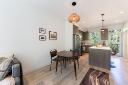 PRIME SQUAMISH DENTVILLE LOCATION! This bright 2BR townhome backs onto peaceful greenspace yet steps from downtown core. Perfect for outdoor enthusiasts & families - walk to schools, shops, trails & brand-new playground! Open-concept living w/ 9ft ceilings, modern finishes, kitchen island & private tree-surrounded patio. XL single car garage also has room to fit all your gear + bikes. Add'l carport parking too for 2nd vehicle. Feat stainless appliances, large windows, east-facing balcony and patio overlooking greenbelt and offering privacy. Newport Landing offers the best of both worlds - convenient urban amenities without the hustle! Efficient layout, powder room main floor, 2BR up. Ready for Squamish mountain lifestyle! Open House - 2-4pm Nov 15th, 2025.
