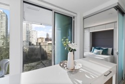 Soak in sweeping 180° unobstructed views from this modern 2-bed + den corner home in the heart of Surrey City Centre. Smart design shines throughout—both bedrooms feature custom Murphy beds to maximize space, while the den includes its own closet, making it a true third-room option. Large windows flood the 750 sq.ft. layout with natural light, creating an airy, elevated feel. Just six years young, this home offers easy access to Holland Park, Surrey Central SkyTrain, Central City’s shops and services. A vibrant, walkable lifestyle with everything at your doorstep.