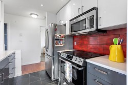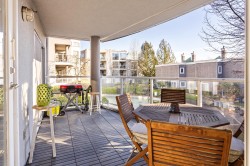 Welcome to this bright & spacious corner unit condo in the Boardwalk! This lovely 2-bed, 2-bath freshly painted home offers the perfect blend of tranquility and modern convenience. Step into the bright open-concept living space featuring hardwood floors, quartz countertops, s/s appliances & laqquer cabinets. A large private deck overlooks a serene courtyard with fountain and is ideal for relaxing or entertaining. The well-maintained rainscreened building offers fantastic amenities, including gym, recreation room, guest suite & work shop. All of this is just steps away from the vibrant River District which has a variety of restaurants, shops and all that the area has to offer. The central location gives you easy access to everything!