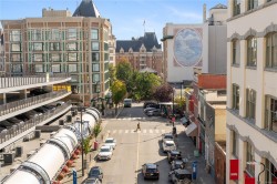 City, mountain, and harbour views await from this stunning 2-bed, 2-bath condo at The Sovereign in the heart of downtown Victoria. With nearly 1,000 sq ft, this home offers luxury, functionality and an unbeatable location, just steps from the Inner Harbour, shops, restaurants, and cultural landmarks. The bright, open layout features a balcony, office nook, and a gourmet kitchen with stainless steel appliances, gas range, stone counters, and a peninsula for four. The primary suite has a walk-in closet and a 4-piece ensuite with heated floors and a soaker tub. A second full bath includes a large walk-in shower. Enjoy comfort year-round with air conditioning and perimeter hot water radiant heat. Residents enjoy premium amenities, including a guest suite and a 12th-floor rooftop terrace with heaters, a gas BBQ, fireplace, and panoramic harbour views. Includes secure underground parking, storage locker, and bike storage. Heat, A/C, hot water, and gas are all included. Pets welcome!