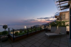Experience ultimate luxury in this rarely available home at the "Terraces at Highgrove" Ideally situated on a private cul-de-sac at the crown of the complex - this home offers an ideal floor plan on 2-levels with entry level access and panoramic views from all vantage points. Concrete home that has been updated throughout; cherry hardwood flooring, Miele/Gaggeneau/Liebherr appliances, custom wine storage and millwork throughout, double sided fireplace, vaulted ceilings, A/C and smart home wired. Large primary with custom walk in closets and spa like bathroom, secondary bedroom w/ensuite and a 3rd bedroom that can be used for guests. Oversized south facing terraces on both levels with views for days. Comes with attached private 2 car garage & storage. Make your downsizing dreams a reality.