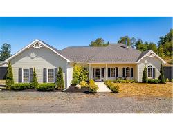 This beautifully designed newer-built home combines modern comfort with estate-like charm. Set back on a long driveway, the property offers privacy and an impressive approach. Inside, the open-concept kitchen, living, and dining areas are anchored by a cozy wood stove built into a striking fireplace. The kitchen features granite countertops, while patio doors lead to an outdoor patio with pergola—ideal for relaxing or entertaining.The layout is thoughtfully planned with two bedrooms and a full bathroom on one side of the home, and a spacious primary suite on the other. The primary retreat includes two walk-in closets and a private ensuite with a tiled shower and granite vanity. A mudroom entry from the attached garage leads to a laundry room, with extra storage and a utility closet for convenience.