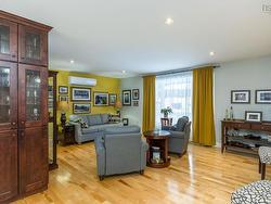 The beautiful property backs on a greenspace, so no one can build behind you. It was mostly rebuilt in 2009 due to a fire. It offers approximately 2390 finished sf. You’ll enjoy the spacious entries found at the front, back and lower level of this home. The concrete drive & vinyl exterior & faux stone accents, allow for low maintenance. The front entry offers shelves for shoe storage. The spacious living room boasts an LG heat pump. Gleaming hardwood floors lead you to the dining room where you’ll find tasteful built-in cabinets with leaded glass doors to showcase your treasures. The stunning kitchen, with quartz countertops, is equipped with a peninsula, maximizing your space for meal prep. Extra features include a broom closet, spice storage, recycle centre, pot drawers & more. The dishwasher, fridge, stove & OTR microwave all remain. A sweep tray for the central vac is also located here. A garden door leads you to a screened-in deck. Plastic enclosures cover the screened areas, during the cooler months. Hardwood floors continue down the hall to the bedrooms. You’ll be delighted to find a walk-in closet & an ensuite bath in the Primary suite. The second bedroom, could double as a home office. A half bath, linen closet, and storage closet are also found nearby. Your family will love spending time together in the light & bright lower level. The family room is equipped with a gravity fed oil stove. A second heat pump is located here. The multi-purpose room offers so many possibilities..a gym, guest space, office or den. A storage pantry & wine room are conveniently located here. The third bedroom is bright and cozy. The folding counter in the laundry room is an added convenience. Your family & quests will enjoy the privacy of the 4 pc bath. The handy person in your household can whittle away the hours in the workshop. Two storage closets are located in the large walk-out level entry. You can also access the backyard & a second small deck from here.
