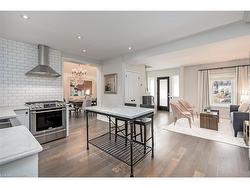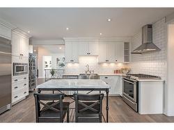 This tastefully renovated century farmhouse sits on one of the most sought after streets in downtown Burlington, offering a truly unique opportunity on a premium park like 60 x 181 ft lot adjacent to the waterfront trail and bike path. This 3 bedroom, 3.5 bathroom home features hardwood floors, exposed brick, skylights and pot lighting that add warmth and character throughout. The main level features a beautiful primary bedroom with a spa inspired 5 piece ensuite and a large walk in closet with stacked washer and dryer. The open concept kitchen includes stainless steel appliances, marble counters, tile backsplash and under cabinet lighting. Enjoy the formal dining room with exposed brick, vaulted ceiling and a rough in wet bar, perfect for entertaining. Along the back is an inviting family room with custom built ins, a charming office or reading nook, and a powder room overlooking the expansive fully fenced backyard. The upper level offers 2 bedrooms and a full bathroom, ideal for kids or guests. The finished lower level provides even more flexibility, featuring a comfortable rec room or home office along with a 3 piece bathroom. There is inside access to the spacious 1.5 car garage with a bonus fully finished kids retreat above, complete with electric fireplace and AC. The driveway provides parking for 4 cars. Steps to schools, parks, Lake Ontario, Spencer Smith Park, the YMCA, performing arts centre, library, shops and restaurants, this home offers an unmatched walk-able lifestyle in downtown Burlington.