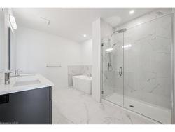 This stunning and spacious 1,295 sq.ft. interior + 80 sq. ft. private balcony, 2-bedroom, 2-bathroom condo- facing the Speed River and steps to downtown Guelph- offers an exceptional combination of luxury and convenience. The bright, open-concept layout is thoughtfully designed for accessibility and showcases luxury finishes including white oak hardwood flooring throughout, 9-foot ceilings, a remote controlled fireplace in the living room, and a designer kitchen flaunting a waterfall quartz island, quartz countertops, full-height backsplash, LED under-cabinet lighting, soft-close drawers, high-end stainless-steel appliances, and a spacious pantry. An abundance of natural light pours through the large windows- complete with roll-up shades for privacy- while the private balcony offers stunning, unobstructed views of the river. The primary suite boasts a generous walk-in closet and a spa-inspired 5-piece ensuite, complete with a freestanding soaker tub and an oversized glass shower. A second bedroom is thoughtfully positioned on the opposite side of the unit, and is conveniently located near a stylish 3-piece bathroom and the in-suite laundry. This condo also includes a secured underground parking space for your comfort and peace of mind. The well-maintained building offers incredible amenities including a gym, guest suite, golf simulator, billiards, a lounge with a library, a second lounge bar with terrace, an outdoor dining terrace and BBQ area, indoor visitor parking, secured bike rooms on all parking levels, and a welcoming community where neighbours truly look out for one another. Just steps away from restaurants, cafés, shops, Market Fresh, the Farmer's Market, the VIA Rail/ GO train and bus stations, and within easy access to riverside trails. This condo delivers the ultimate lifestyle in one of Guelph's most desirable locations.