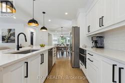 Welcome to the West End gem you've been waiting for where every detail is designed for real family living. Step into this beautifully reimagined 4-bedroom, 3-bathroom home in one of Guelphs most loved neighbourhoods. Fully renovated and thoughtfully updated, this home blends stylish modern finishes with functional spaces that truly work for how families live, gather, and grow today. Inside, you'll find a bright, open-concept layout with wide-plank engineered hardwood floors and a custom kitchen that makes both everyday meals and weekend entertaining a breeze. The show-stopping waterfall island is just waiting for pancake breakfasts and evening chats over wine.Two separate living areas including one with a cozy wood-burning fireplace give you the flexibility to create a playroom, reading nook, or a quiet space to unwind after bedtime routines.Outside, your private backyard oasis awaits. With nearly 400 sq ft of patio space, there is plenty of room for summer BBQs, cozy fire pits, or just watching the kids play. This is outdoor living, family-style. Upstairs, the spa-inspired primary suite is the retreat you didn't know you needed, complete with a huge walk-in closet and a luxury ensuite with a soaker tub, oversized glass shower, and double vanity.The finished lower level adds even more to love, including a dedicated work-from-home zone, bar area, and cold storage perfect for growing families or weekend guests.With newer mechanicals (Furnace 2023, A/C 2022, Water Softener & Water Heater 2023), all that is left to do is move in and make it your own.This isn't just a house its the backdrop for your families next chapter. Come see it for yourself and imagine the memories you'll make here. (id:27)
