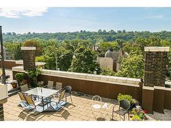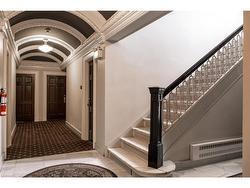 Welcome to the historic “Herkimer Apartments”, one of Hamilton’s most prestigious condo conversions, located in the heart of the Durand neighbourhood. Designed by renowned architect William Palmer Witton and built in 1915, this landmark was once the pinnacle of luxury living, featuring marble staircases, ornate moldings, steam heating, and Canada’s first elevator and central vac system. It remains Ontario’s last standing building with a terracotta portico. Today, Herkimer Apartments continues to captivate with 23 exquisite condo’s including this stunning 1,728 sq ft unit, which retains its original floorplan and offers two separate entrances. Inside, you'll find gleaming dark hardwood floors, soaring high ceilings, 10” baseboards, crown molding, and elegant finishes throughout. The original servant’s door, steps into a discreet back entry with storage, a stunning 2-piece bath, laundry, and utility room. The bright, spacious kitchen features granite countertops, stainless steel appliances, butler pantry station, and original swinging door leading to the formal dining room, ideal for hosting dinner parties and family gatherings. An adjacent sunroom features built-in bookcases and is the perfect space for a den or home office. The formal front entrance invites you into a spacious hallway and elegant living room featuring a fireplace with stunning Carrara marble surround and built-in bookshelves and the perfect place to relax or entertain. The bedroom wing boasts a newly renovated 4-piece bath with marble floors and two spacious bedrooms, including the primary with walk-in closet. Residents have access to a rooftop terrace with panoramic city views to enjoy. Updates incl furnace (2020) washer & dryer (2019) both bathrooms (2019). Just steps from St. Joseph’s Hospital, Locke Street S, parks, trails, GO Station and Hwy 403 access makes this is an extraordinary opportunity for the sophisticated buyer seeking a home with timeless elegance and historical significance. RSA.