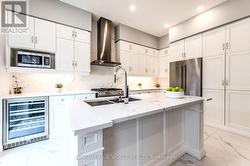 Dare to be impressed in The "Rahi" Model boasting over 3444sqft of finished living space w/a 3 bed + 2 bed, 3 1/2 bath floor plan w/upper family room and a host of premium features. IMPRESSIVE 8 FOOT TALL FRONT ENTRY DOOR, setting the tone for the lavish interiors that await. The designer kitchen is adorned with upgraded Heirloom-style maple cabinetry, soft-close cabinets, and a QUARTZ COUNTERTOP & BACKSPLASH THAT EXUDE SOPHISTICATION. Enhancing its allure is the island w/upgraded corner posts, a wine fridge, gas stove with an upgraded stainless chimney hood fan, and in-floor heating. A 6 ft patio door featuring a transom window above, inviting natural light and seamless indoor-outdoor living. Gather around the NAPOLEON GAS FIREPLACE IN THE GREAT ROOM, illuminated by pot lights strategically added for ambiance. The opulence extends to every bathroom, where UPGRADED QUARTZ COUNTERTOPS AND MAPLE SHAKER CABINETS create a spa-like atmosphere. Revel in the luxury of a 10 ft main floor ceiling height, 12x24 CERAMIC TILE FLOORING in the foyer, kitchen, and bathrooms, alongside maple hardwood flooring in the Great room, dining room, family room, and upper hallway. Ascend the MAPLE HARDWOOD STEPS ADORNED WITH BLACK WROUGHT IRON SPINDLES, leading to an upper family room for additional relaxation and leisure. Retreat to the generously sized primary bedroom which features a walk-in closet. The master ensuite, a sanctuary featuring DOUBLE VESSEL SINKS, A FREESTANDING TUB, AND A GLASS-ENCLOSED SHOWER with a rain shower head, EPITOMIZING INDULGENCE AND STYLE. Professionally finished by the builder, the basement offers additional living space with a 9 ft ceiling, two bedrooms, and a 3 pc bathroom, illuminated by two Egress windows that flood the space with natural light. Outside, unwind in the fully fenced backyard, complete with a retractable awning and deck, perfect for dining and entertaining. (id:7525)