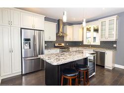 Welcome to this executive 4-bedroom, 4-bathroom detached 2-storey home, built in 2016 and located in the prestigious Fernwood Estates subdivision in Niagara Falls. Step inside to find rich, dark hardwood flooring throughout both the main and second floors, with no broadloom anywhere in the home. Nine-foot smooth ceilings and pot lights on the main level create a bright, upscale feel, while the impressive open-to-above foyer sets the tone for the rest of the home. The gourmet kitchen is a chef's dream, featuring granite countertops, a stylish backsplash, a breakfast bar, and stainless steel appliances. Porcelain tiles highlight the foyer and spacious laundry room, which also provides a walkout to the double-car garage. Upstairs, the large primary suite offers a luxurious 5-piece ensuite bath and a walk-in closet. Three additional well-sized bedrooms share a third 4-piece bathroom. The finished lower level, accessible via a separate walk-up through the garage, offers vinyl flooring, a large recreation/family room, a potential fifth bedroom, a full 3-piece bathroom, and a cold room for extra storage. The exterior is equally impressive, featuring a stone and stucco finish, an exposed aggregate driveway with parking for four vehicles, and a covered concrete patio ideal for outdoor entertaining. Built with style and functionality in mind, this 2016 home combines elegance, comfort, and premium finishes throughout.